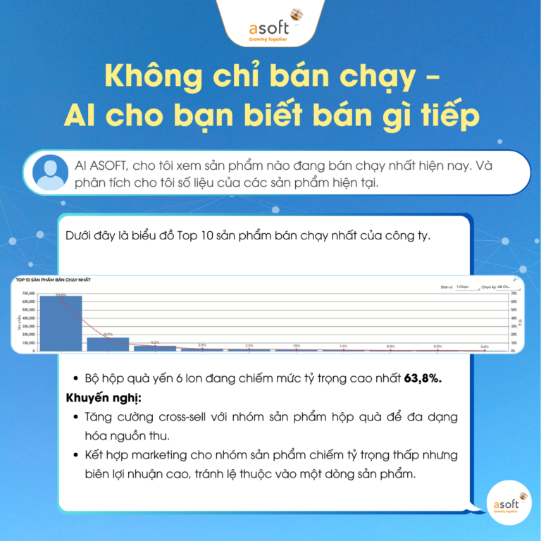 Một biểu đồ top sản phẩm bán chạy chỉ cho doanh nghiệp biết “điều đã xảy ra”. Nhưng với AI Agent trong ASOFT-ERP9, doanh nghiệp còn biết điều gì sẽ xảy ra tiếp theo và quan trọng hơn: cần làm gì ngay lúc này.