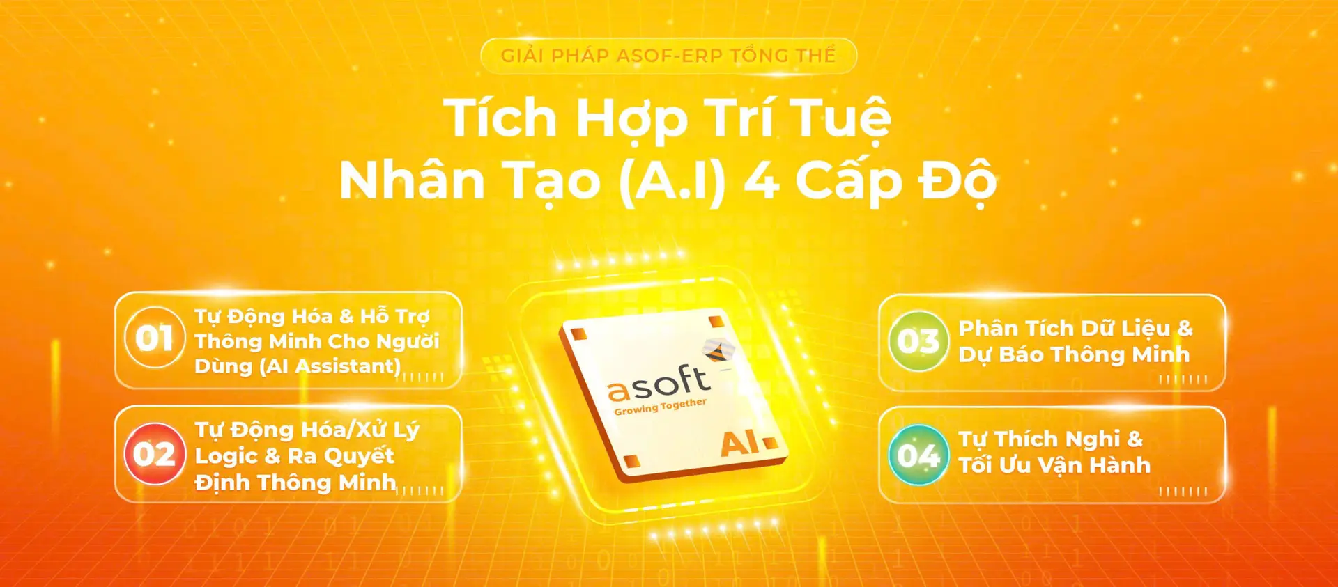 ASOFT-SO không chỉ dừng lại ở việc số hóa quy trình làm việc mà còn tích hợp AI vào lõi hệ thống, giúp doanh nghiệp biến dữ liệu vận hành hằng ngày thành hành động thông minh theo 4 cấp độ sau: