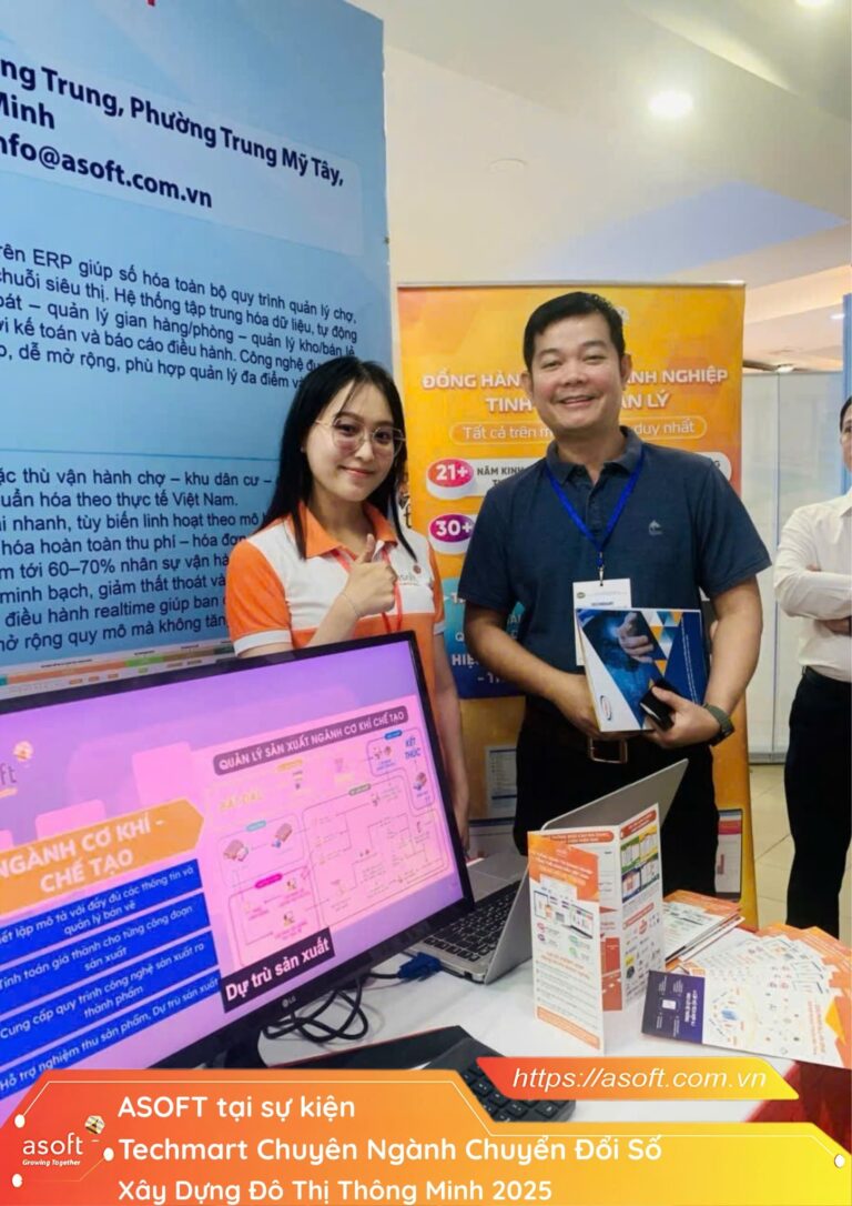 Ngày 11-12.12.2025 ASOFT tham dự gian hàng trưng bày tại sự kiện “Techmart chuyên ngành chuyển đổi số xây dựng đô thị thông minh” Với sự quy tụ của các doanh nghiệp, nhà quản lý, đơn vị công nghệ tại TPHCM. Với hàng loạt giải pháp chuyển đổi số nổi bật: ERP, IoT, AI, quản lý dữ liệu lớn, công nghệ vận hành doanh nghiệp & đô thị. trong quản lý đô thị, y tế số, giáo dục, du lịch thông minh, hướng đến mô hình vận hành tối ưu – bền vững – nâng trải nghiệm sống.