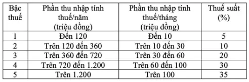 Theo đó, biểu thuế lũy tiến từng phần với thu nhập cá nhân giảm từ 7 bậc xuống còn 5 bậc và nới rộng khoảng cách giữa các bậc. Và theo đó, mức thuế thấp nhất là 5% áp dụng với thu nhập đến 10 triệu đồng một tháng. Thuế suất cao nhất vẫn là 35% với thu nhập trên 100 triệu đồng, thay vì mức 80 triệu như hiện nay.