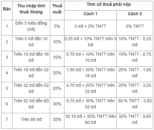 Theo Thông tư 111/2013/TT-BTC thì biểu thuế TNCN từ tiền lương, tiền công hiện hành có 7 bậc, thấp nhất là 5% và cao nhất đến 35%
