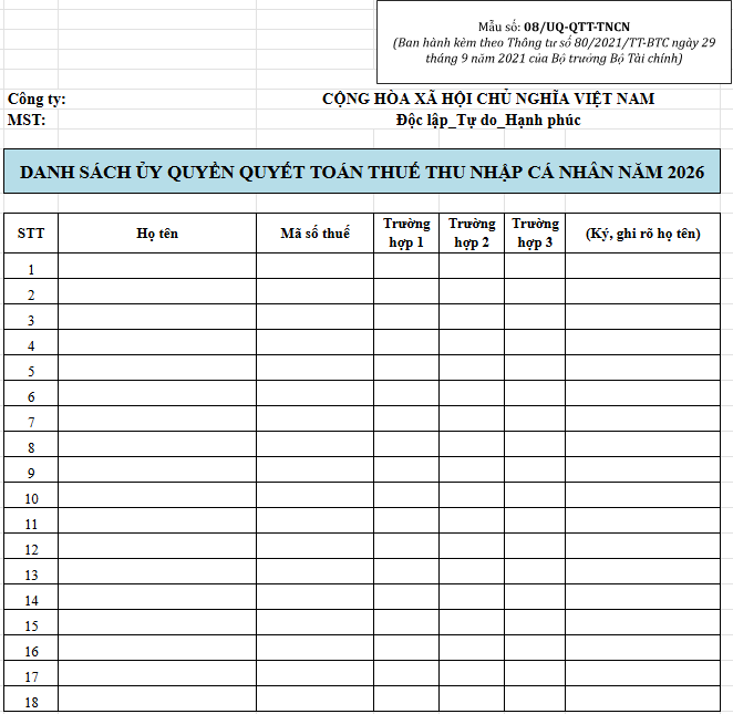 * Mẫu danh sách uỷ quyền Quyết toán thuế TNCN cho nhiều người. Tải biểu mẫu tải ngay đây