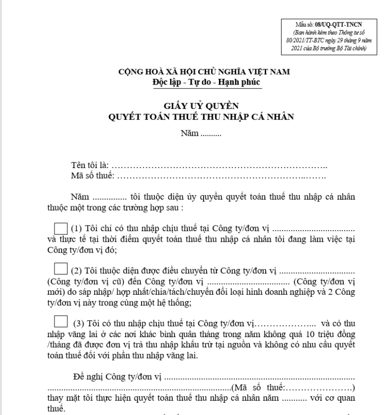 Đó là mẫu 08/UQ-QTT-TNCN được quy định tại Phụ lục II ban hành kèm theo Thông tư 80/2021/TT-BTC. Tải biểu mẫu tại đây