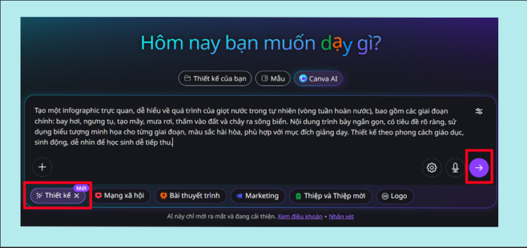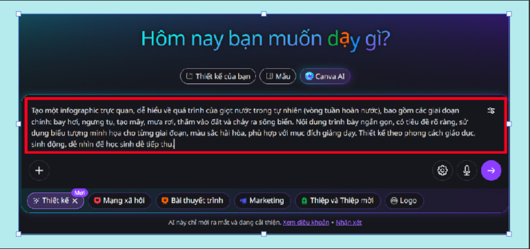 - Viết câu lệnh hoàn chỉnh, rõ ràng để Canva AI dễ hiểu và tạo đúng nội dung.