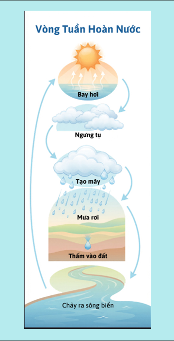 Tạo infographic về vòng tuần hoàn nước gồm các bước bay hơi, ngưng tụ, tạo mây và mưa rơi. Thiết kế theo phong cách giáo dục, màu sắc sinh động, có biểu tượng minh họa cho từng giai đoạn, bố cục rõ ràng dễ hiểu cho học sinh.