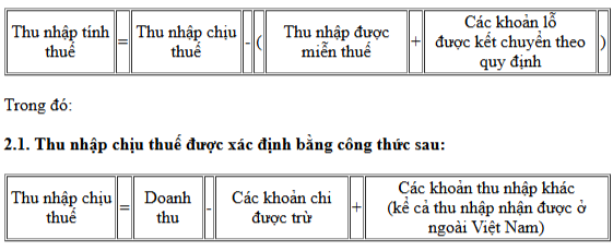 - Thu nhập tính thuế = Thu nhập chịu thuế − (Thu nhập được miễn thuế + Các khoản lỗ được kết chuyển)