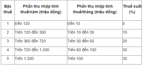 Mức thuế thấp nhất là 5% áp dụng với thu nhập đến 10 triệu đồng một tháng. Thuế suất cao nhất vẫn là 35% với thu nhập trên 100 triệu đồng, thay vì mức 80 triệu như hiện nay.