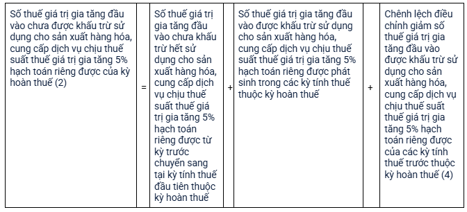 Chênh lệch điều chỉnh tăng, giảm số thuế GTGT đầu vào được khấu trừ của các kỳ tính thuế trước kỳ hoàn thuế sử dụng cho sản xuất hàng hóa, cung cấp dịch vụ chịu thuế suất thuế giá trị gia tăng 5% hạch toán riêng được (4) = Điều chỉnh tăng số thuế giá trị gia tăng đầu vào được khấu trừ sử dụng cho sản xuất hàng hóa, cung cấp dịch vụ chịu thuế suất thuế giá trị gia tăng 5% hạch toán riêng được của các kỳ tính thuế trước kỳ hoàn thuế trừ (–) Điều chỉnh giảm số thuế giá trị gia tăng đầu vào được khấu trừ sử dụng cho sản xuất hàng hóa, cung cấp dịch vụ chịu thuế suất thuế giá trị gia tăng 5% hạch toán riêng được của các kỳ tính thuế trước kỳ hoàn thuế.