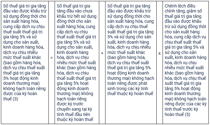Chênh lệch điều chỉnh tăng, giảm số thuế GTGT   đầu vào được khấu trừ sử dụng đồng thời cho sản xuất hàng hóa, cung cấp dịch vụ chịu thuế suất thuế giá trị gia tăng 5% và sử dụng cho sản xuất, kinh doanh hàng hóa, dịch vụ chịu nhiều mức thuế suất khác (bao gồm hàng hóa, dịch vụ chịu thuế suất thuế giá trị gia tăng 5% hoạt động kinh doanh thương mại) không hạch toán riêng được của các kỳ tính thuế trước kỳ hoàn thuế (5) = Điều chỉnh tăng số thuế giá trị gia tăng đầu vào được khấu trừ sử dụng đồng thời cho sản xuất hàng hóa, cung cấp dịch vụ chịu thuế suất thuế giá trị gia tăng 5% và sử dụng cho sản xuất, kinh doanh hàng hóa, dịch vụ chịu nhiều mức thuế suất khác (bao gồm hàng hóa, dịch vụ chịu thuế suất thuế giá trị gia tăng 5% hoạt động kinh doanh thương mại) không hạch toán riêng được của các kỳ tính thuế trước kỳ hoàn thuế trừ (–) Điều chỉnh giảm số thuế giá trị gia tăng đầu vào được khấu trừ sử dụng đồng thời cho sản xuất hàng hóa, cung cấp dịch vụ chịu thuế suất thuế giá trị gia tăng 5% và sử dụng cho sản xuất, kinh doanh hàng hóa, dịch vụ chịu nhiều mức thuế suất khác (bao gồm hàng hóa, dịch vụ chịu thuế suất thuế giá trị gia tăng 5% hoạt động kinh doanh thương mại) không hạch toán riêng được của các kỳ tính thuế trước kỳ hoàn thuế.