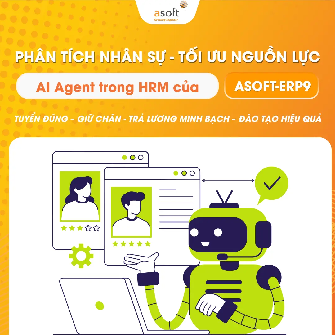 AI Agent HRM trong ASOFT-ERP9 giúp doanh nghiệp tuyển đúng, giữ chân nhân tài, tính lương minh bạch và đo lường hiệu quả đào tạo. Giải pháp HRM thông minh…