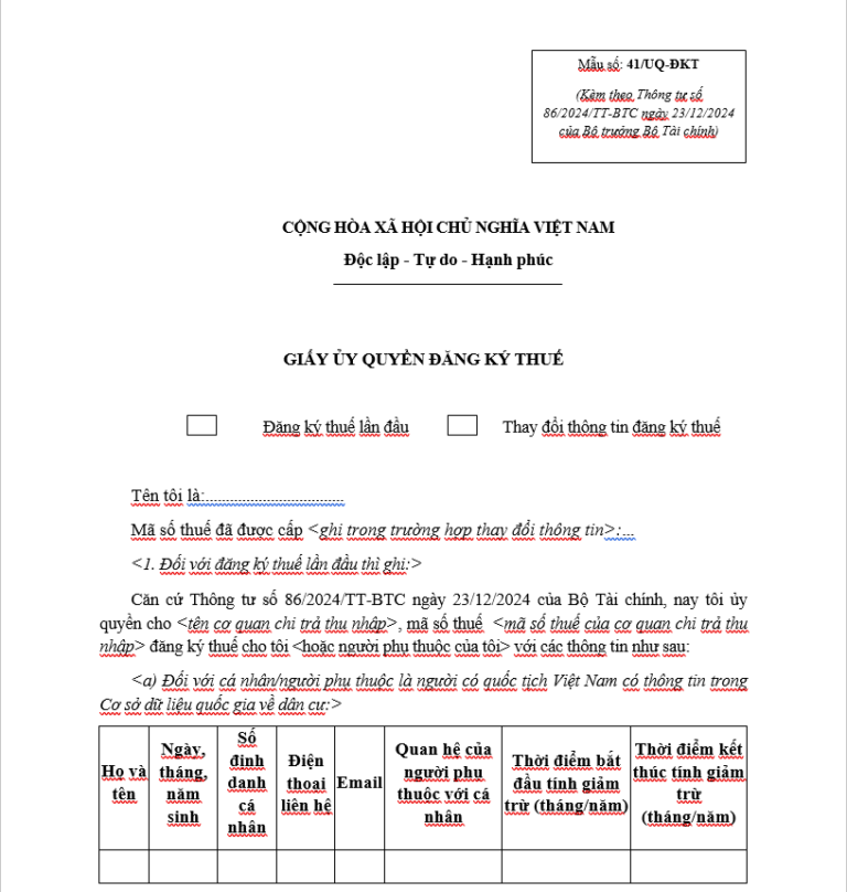 Mẫu số 41/UQ-ĐKT được ban hành Kèm theo Thông tư số 86/2024/TT-BTC là mẫu giấy ủy quyền đăng ký thuế mới nhất năm 2026 hiện nay, dùng để cá nhân ủy quyền cho doanh nghiệp đăng ký mã số thuế TNCN hoặc đăng ký người phụ thuộc để tính giảm trừ gia cảnh khi tính thuế TNCN.
