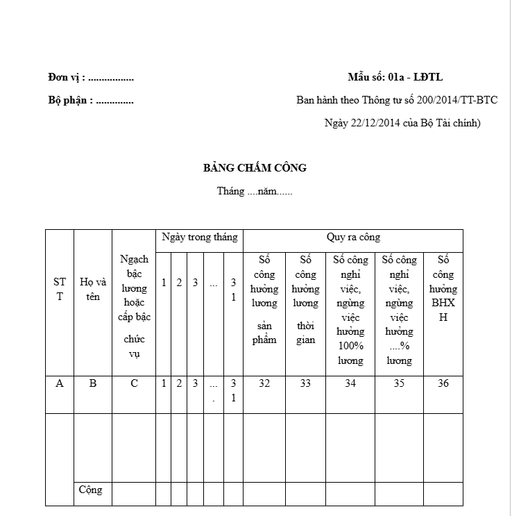 Mẫu bảng chấm công mới nhất năm 2026 hiện nay được quy định tại Mẫu 01a ban hành theo Thông tư 200/2014/TT-BTC hướng dẫn Chế độ kế toán Doanh nghiệp do Bộ Tài chính ban hành như sau: