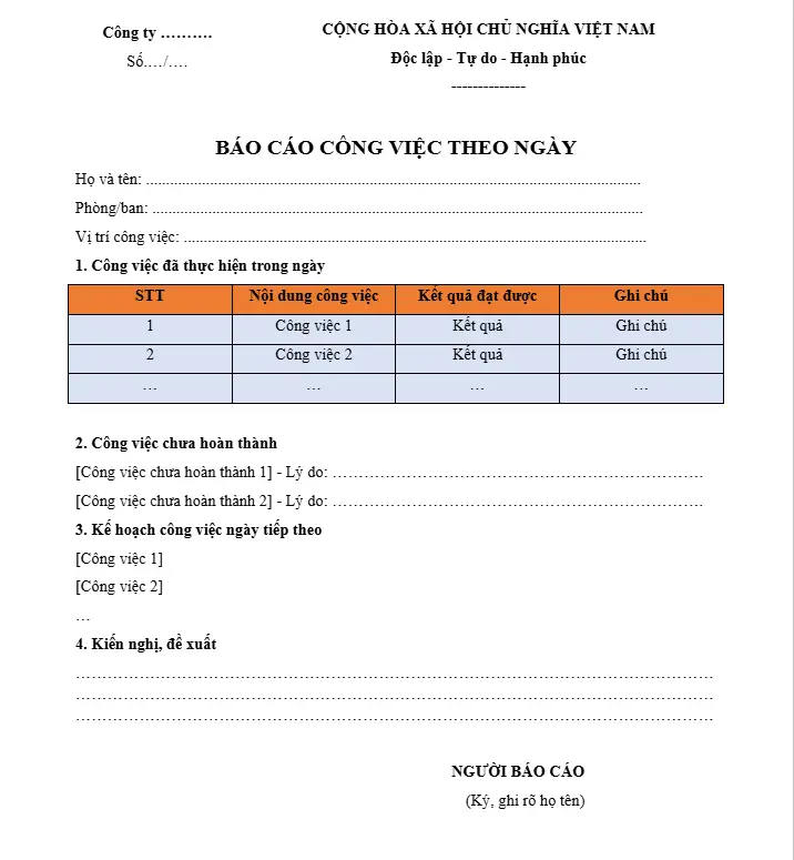 Mẫu báo cáo công việc theo ngày file Word