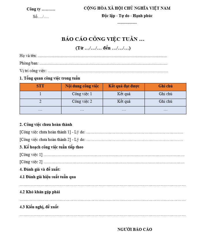 Mẫu báo cáo công việc theo tuần  file Word