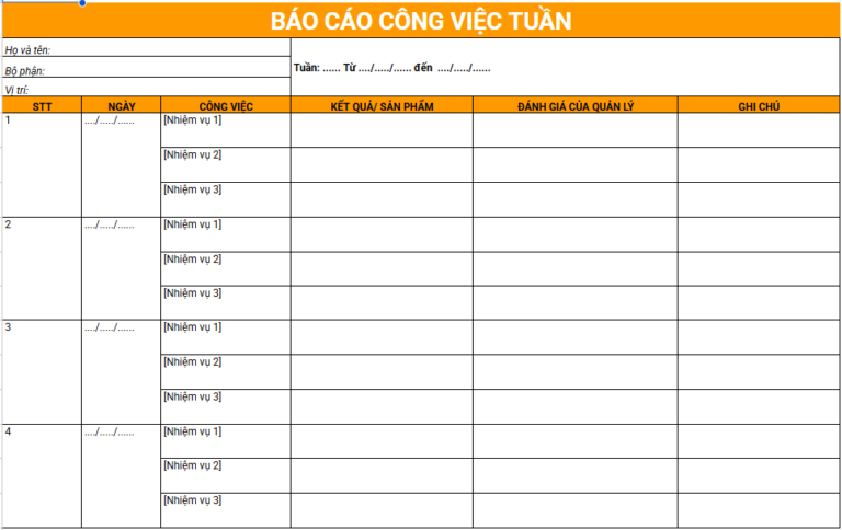 Mẫu báo cáo công việc theo tuần  file Excel