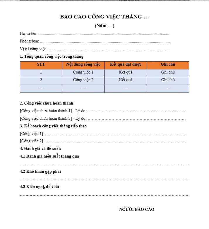 Mẫu báo cáo công việc theo tháng file Word