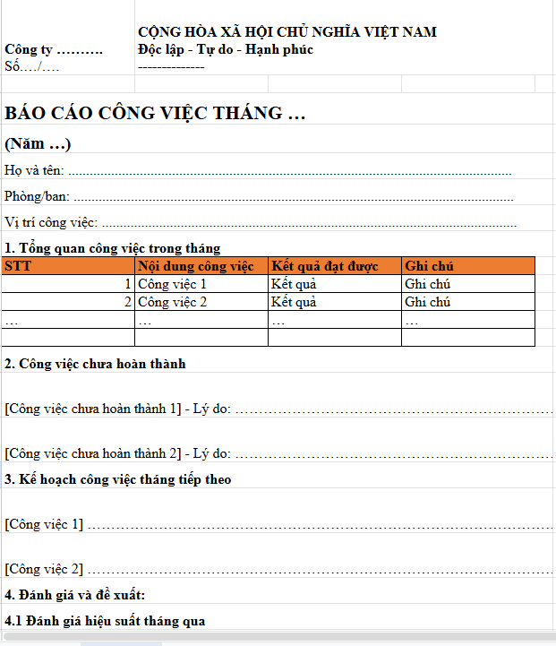 Mẫu báo cáo công việc theo tháng file Excel