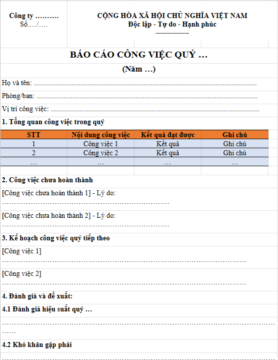 Mẫu báo cáo công việc theo quý file Word