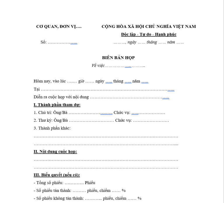Dưới đây là mẫu biên bản cuộc họp 2026 và hướng dẫn cách điền mẫu biên bản họp: