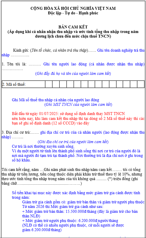 Trường hợp cá nhân chỉ có duy nhất thu nhập thuộc đối tượng phải khấu trừ thuế theo tỷ lệ nêu trên, nhưng ước tính tổng mức thu nhập chịu thuế của cá nhân sau khi trừ gia cảnh chưa đến mức phải nộp thuế, thì cá nhân có thu nhập làm cam kết (theo mẫu ban hành kèm theo văn bản hướng dẫn về quản lý thuế) gửi tổ chức trả thu nhập để tổ chức trả thu nhập làm căn cứ tạm thời chưa khấu trừ thuế thu nhập cá nhân.