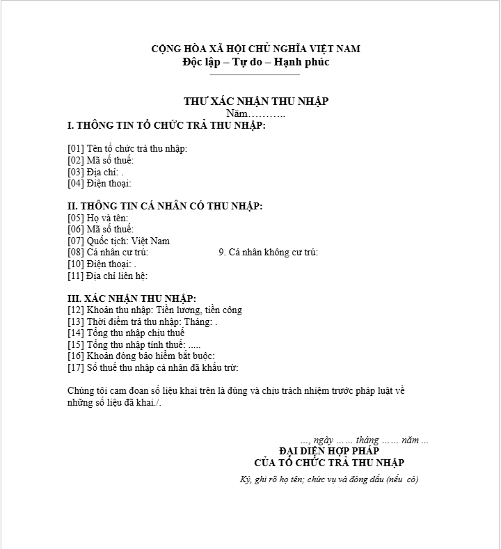 Có thể tham khảo mẫu Thư xác nhận thu nhập 2026 để quyết toán thuế TNCN tại đây: