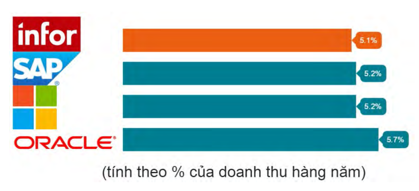 Chỉ số này dùng % của doanh thu hàng năm để đánh giá. Nó cũng được điều chỉnh lại để ghi nhận sự khác biệt về quy mô giữa các công ty. Infor là công ty dẫn đầu, với chi phí triển khai trung bình tương đương 5,1% doanh thu hàng năm. Theo sát sau đó là SAP và Microsoft, cùng với 5,2%. Một điểm nổi bật là ngân sách của đa số các dự án ERP đều vượt so với ngân sách dự kiến.