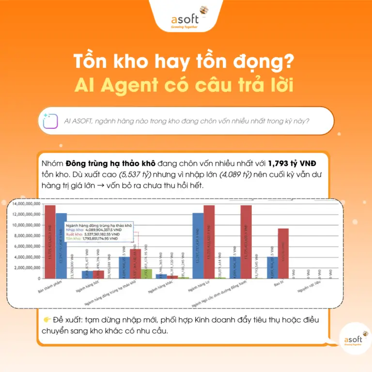 Đây chính là lúc AI Agent trong ASOFT-ERP9 giúp biến dữ liệu tồn kho thành hành động cụ thể.