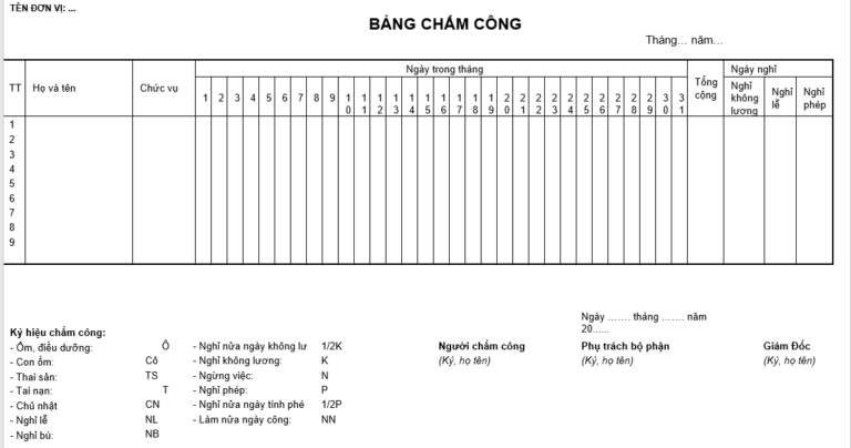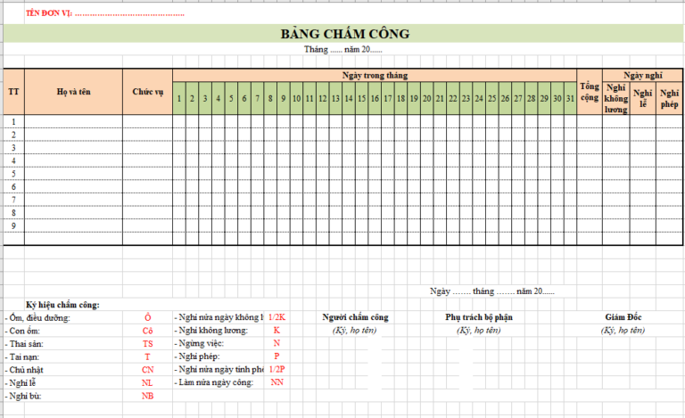 Biểu mẫu bảng chấm công file excel_ Mẫu 1 mới nhất. Tải ngay tại đây