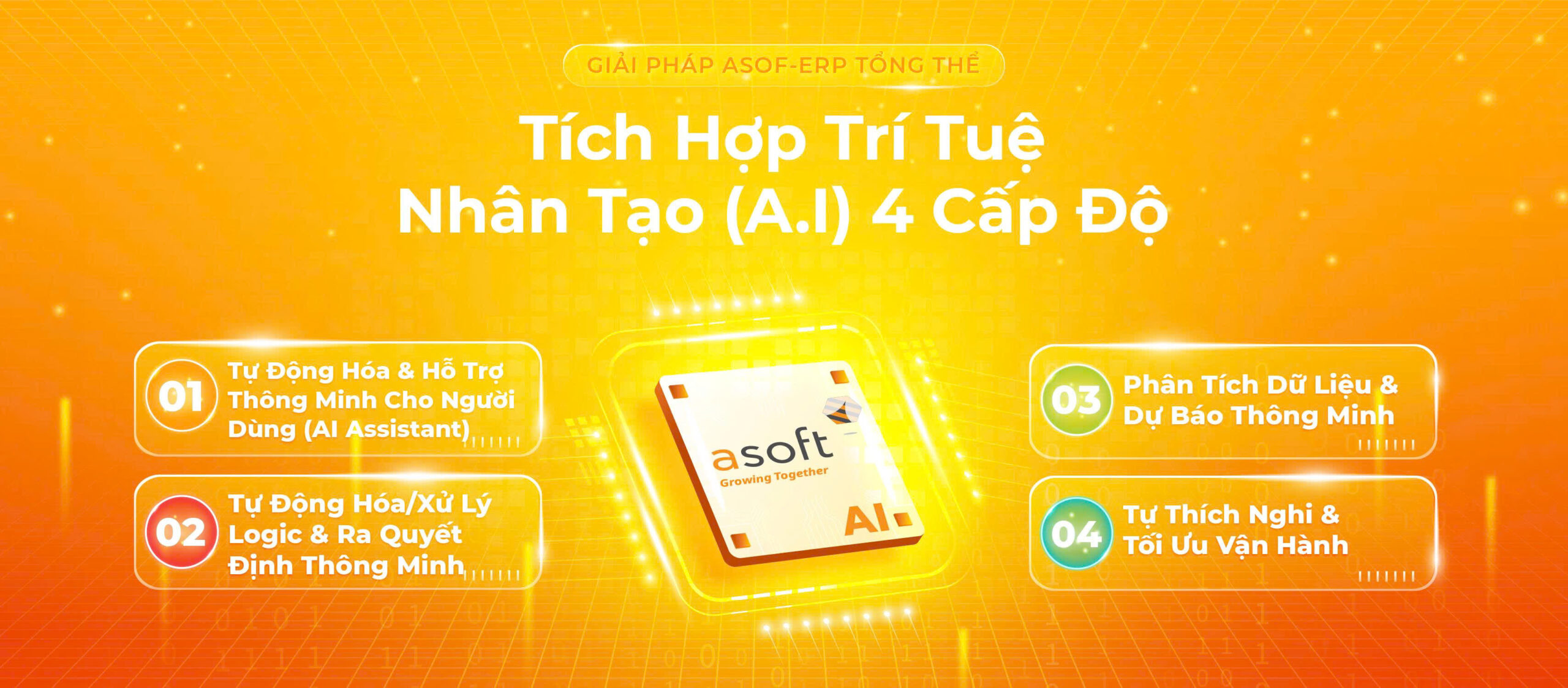 ASOFT-ERP không chỉ dừng lại ở việc số hóa quy trình làm việc mà còn tích hợp AI vào lõi hệ thống, giúp doanh nghiệp biến dữ liệu vận hành hằng ngày thành hành động thông minh theo 4 cấp độ sau: